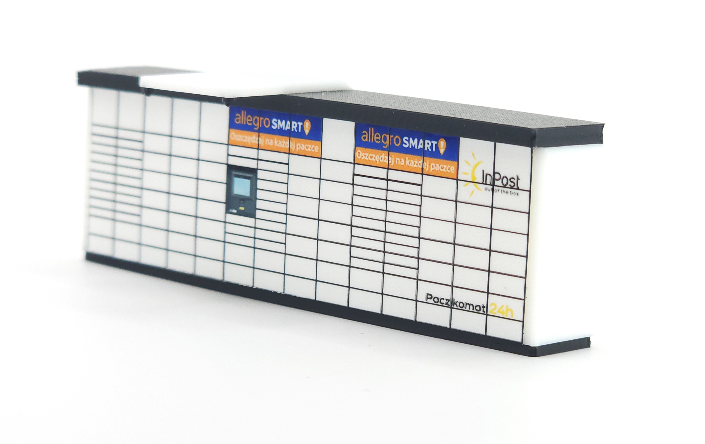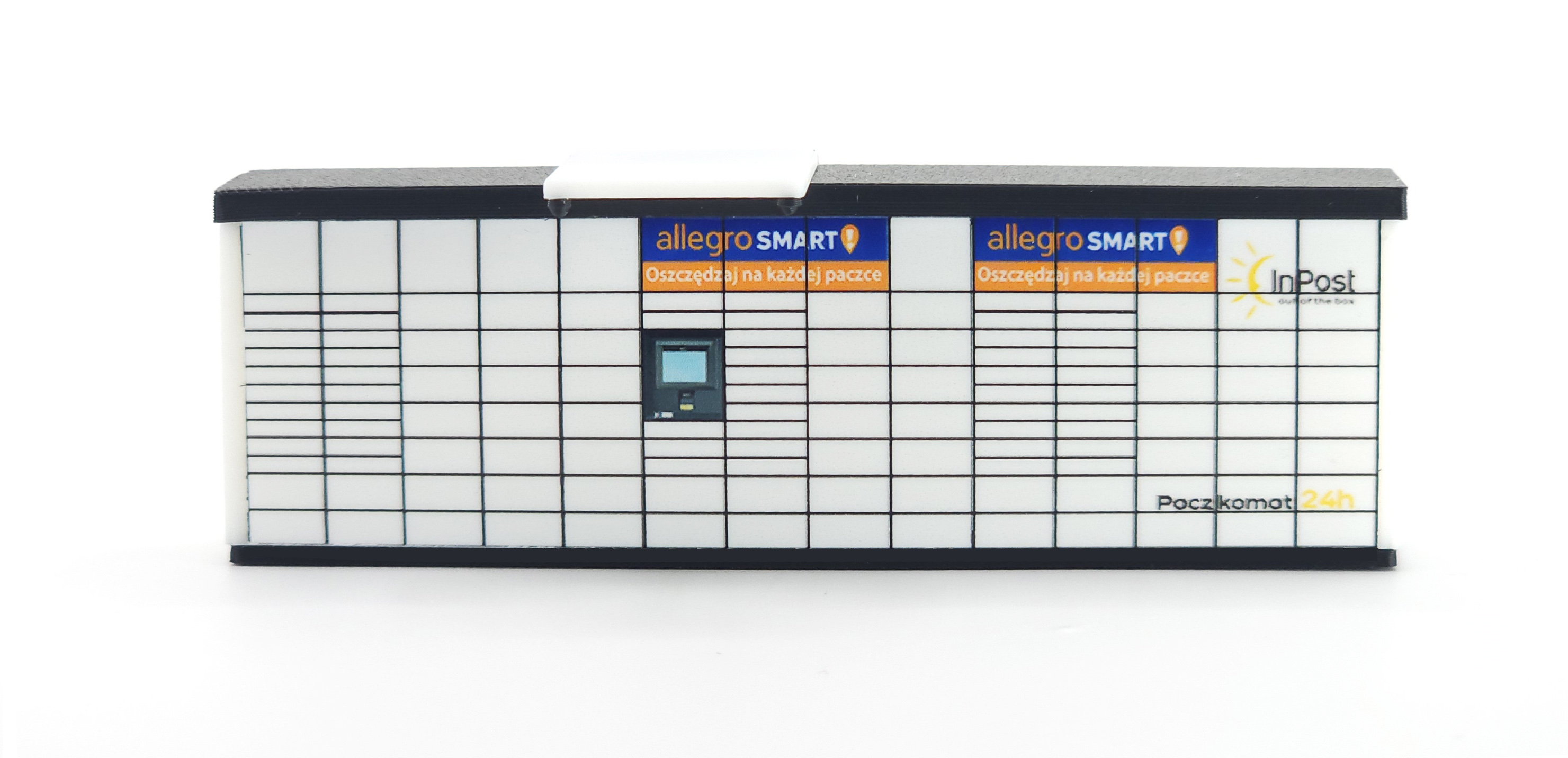 Model nowoczesnego automatu paczkowego w białej kolorystyce, inspirowanego popularnymi urządzeniami do odbioru i nadawania przesyłek. Tego typu automaty można dziś spotkać niemal w każdej miejscowości, dlatego świetnie uzupełniają współczesne makiety kolejowe, dioramy miejskie oraz sceny przedstawiające nowoczesną infrastrukturę.