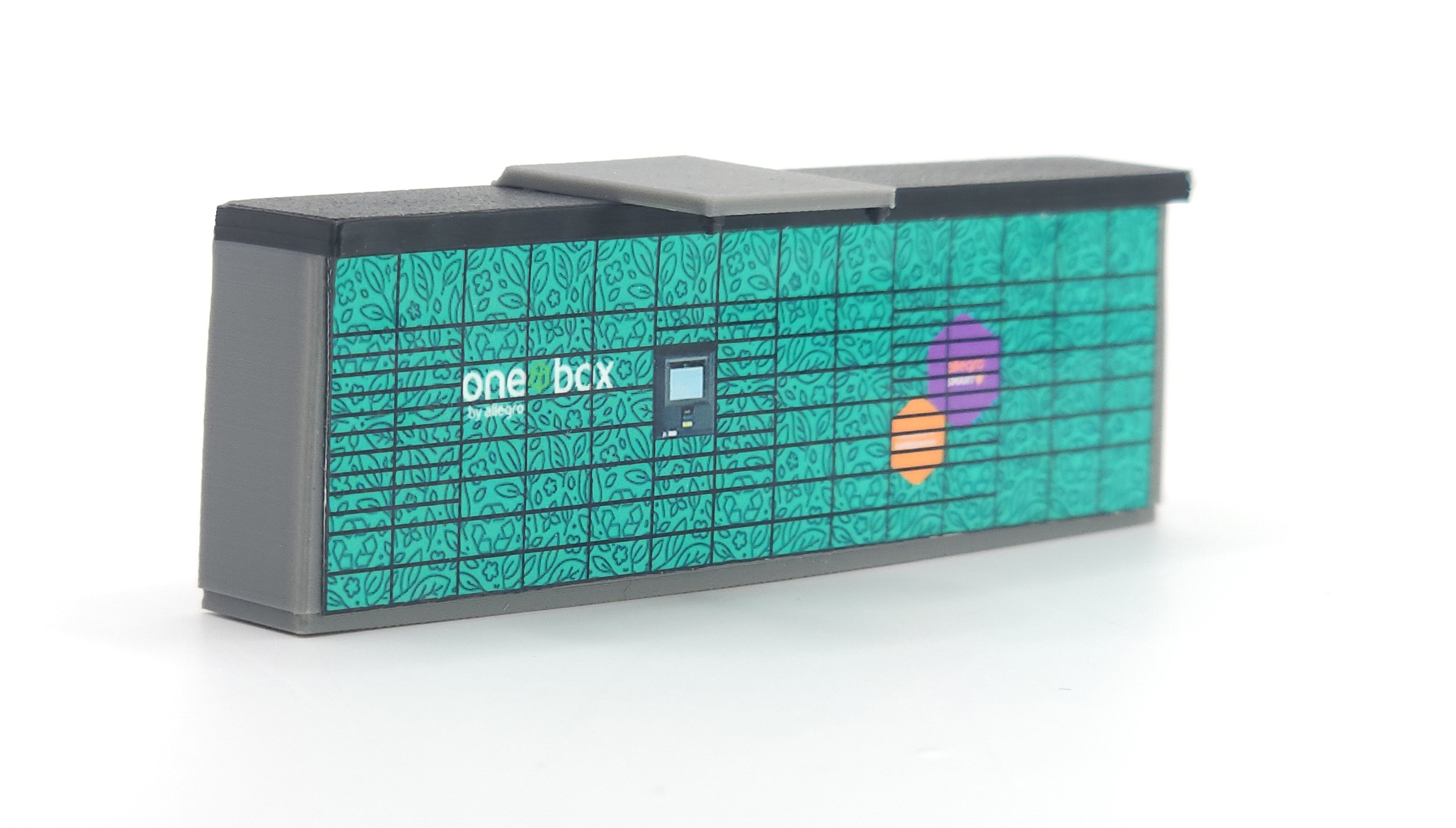 Model nowoczesnego automatu paczkowego w zielonej kolorystyce, inspirowanego popularnymi urządzeniami do odbioru i nadawania przesyłek. Tego typu automaty można dziś spotkać niemal w każdej miejscowości, dlatego świetnie uzupełniają współczesne makiety kolejowe, dioramy miejskie oraz sceny przedstawiające nowoczesną infrastrukturę.