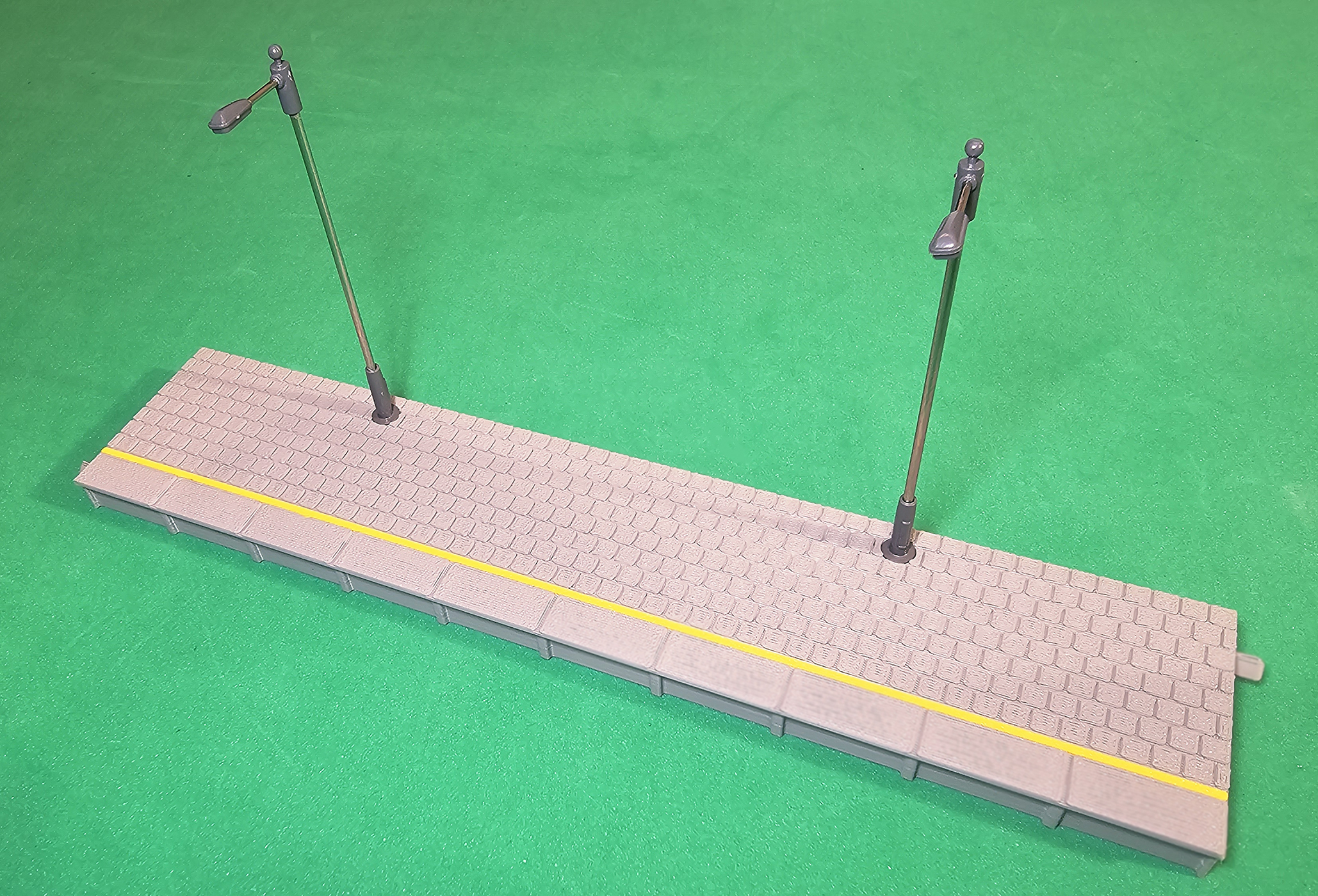 Modułowy peron boczny w skali H0, wyposażony w 2 latarnie LED, inspirowany klasyczną infrastrukturą kolejową z czasów PRL. Idealny do budowy małych przystanków, stacji lokalnych oraz rozbudowanych układów peronowych na makietach kolejowych H0.