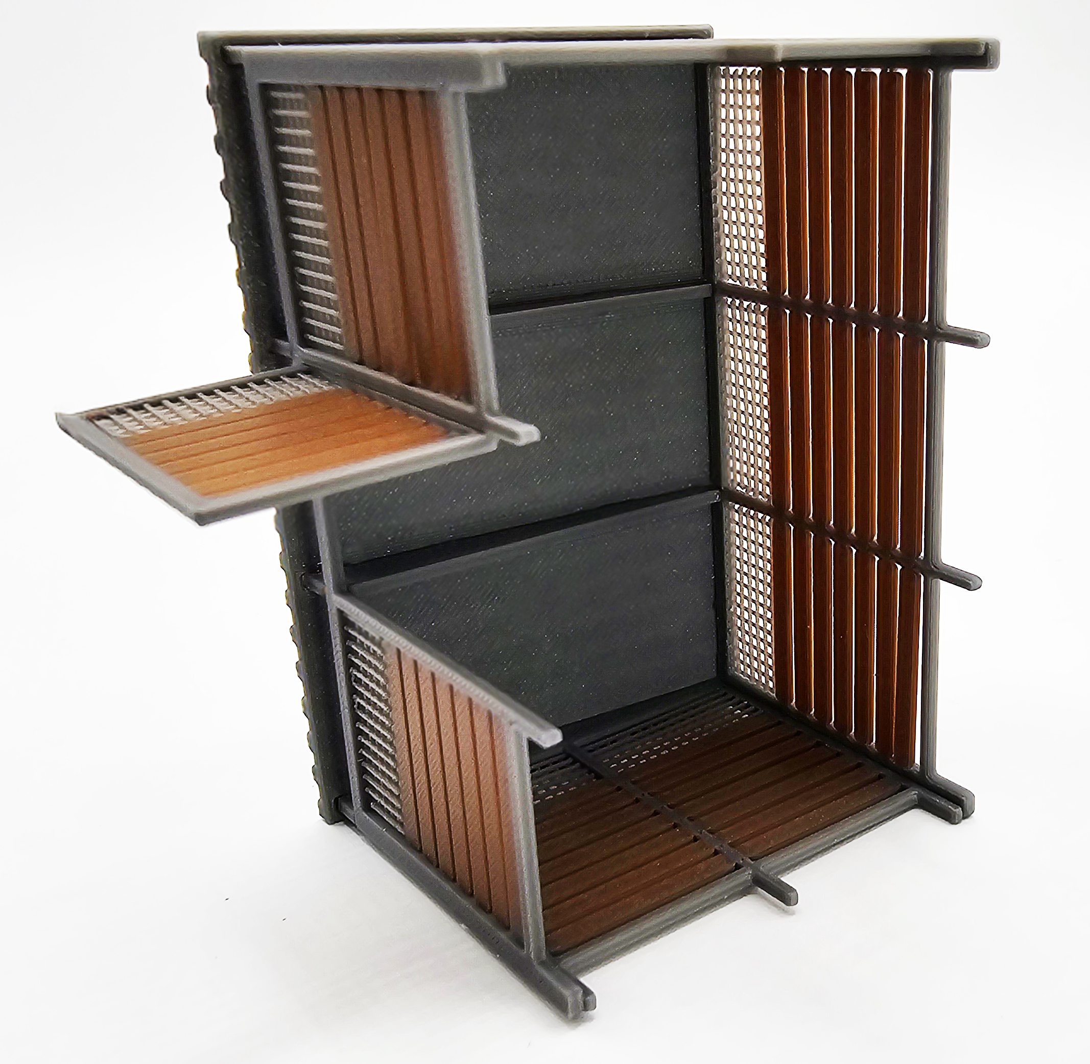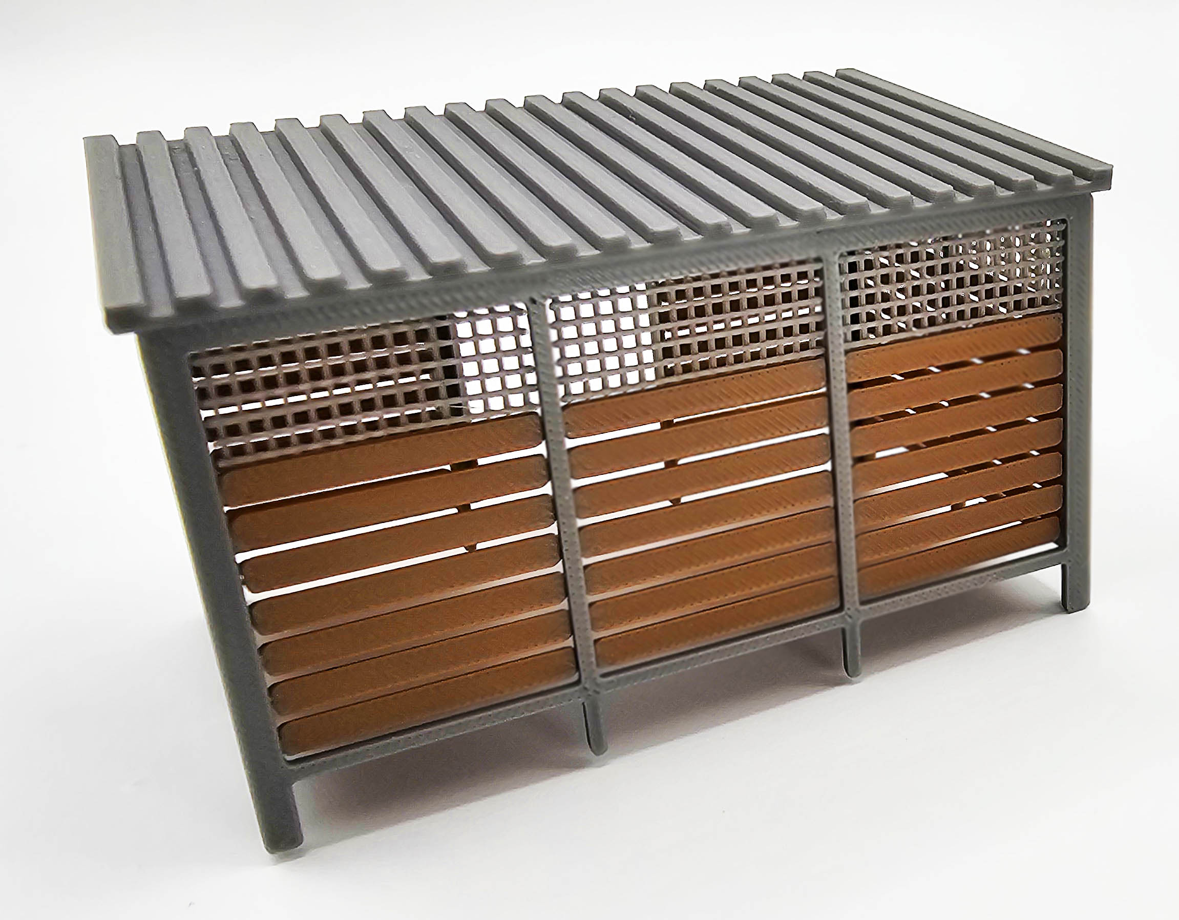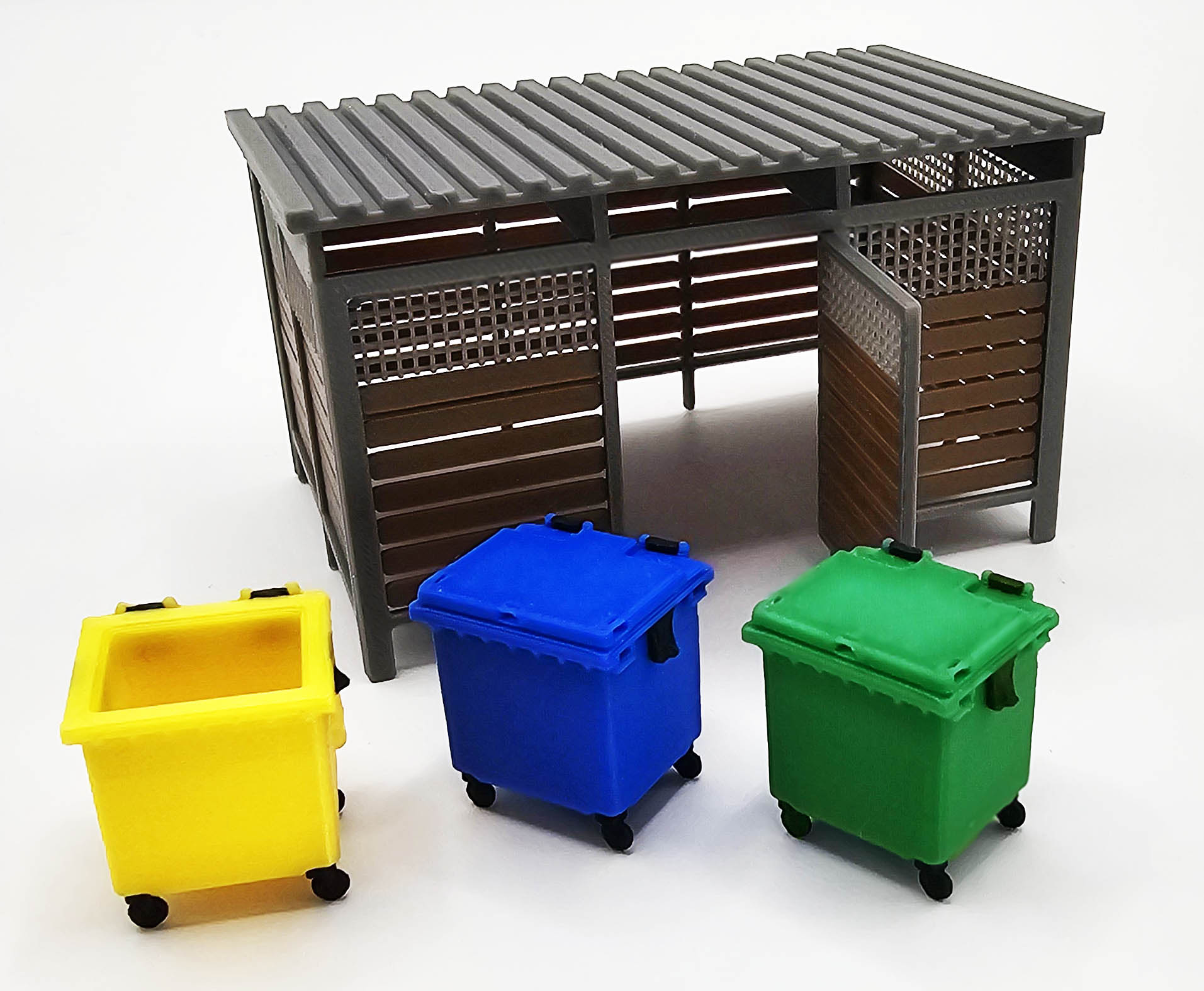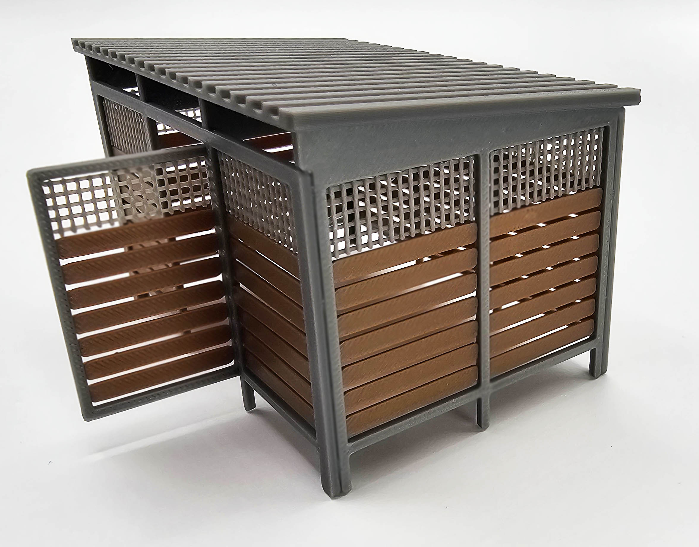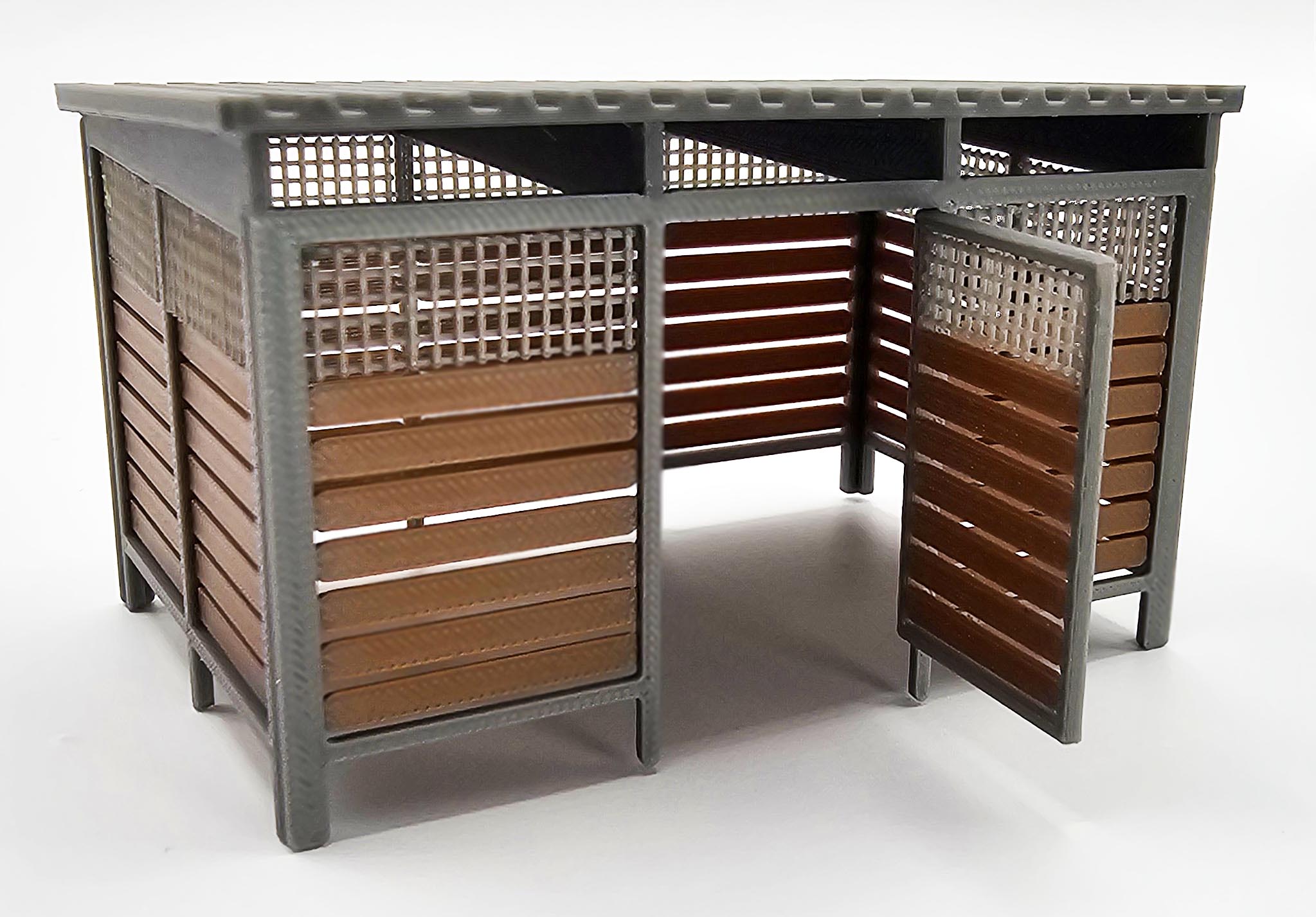Nowoczesna wiata śmietnikowa w skali H0 (1:87), zaprojektowana z myślą o współczesnych osiedlach, zapleczach technicznych oraz przestrzeniach miejskich na makietach kolejowych i dioramach. Model wiernie odwzorowuje lekką, ażurową konstrukcję z zadaszeniem oraz zestaw trzech kontenerów na odpady.
